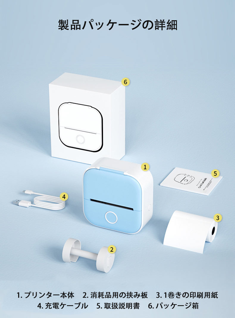 • 印刷用紙サイズ:3.5m x 50mm(この印刷用紙は粘着性のあるサーマル紙で、印刷後はどこにでも貼り付けることができます。)